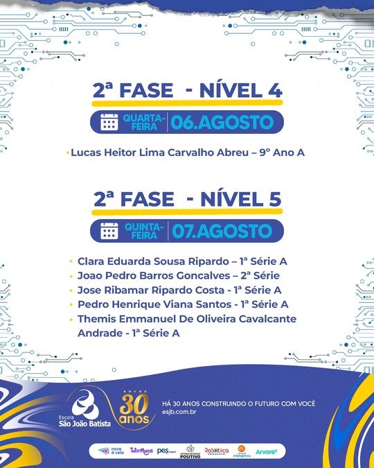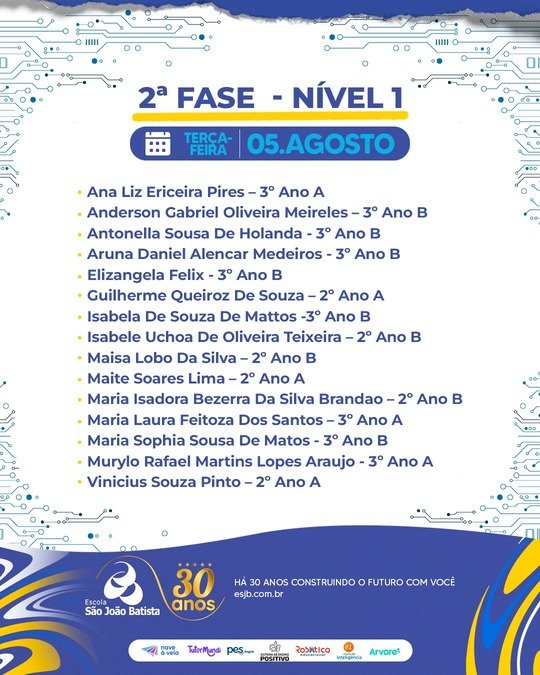 É com grande orgulho que divulgamos os nomes dos nossos estudantes classificados para a próxima fase da Olimpíada Brasileira de Robótica (OBR) – uma das mais importantes competições científicas do país! A Etapa Teórica desafia o raciocínio lógico, o conhecimento em tecnologia e a capacidade de resolver problemas práticos, e nossos alunos mostraram que estão prontos para ir ainda mais longe! Parabéns a cada classificado! Essa conquista é fruto de dedicação, esforço e muito talento! Desejamos sucesso na 2ª fase! Vamos com tudo!